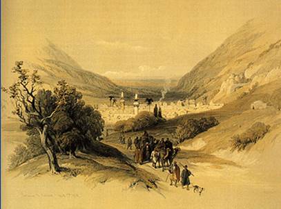 Mount Ebal (right), Mount Gerizim (left) and between them the town of Shechem. By David Roberts, 1842