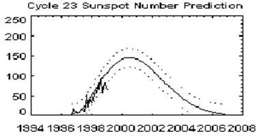 1999 – 2000 – Sunspont activity reaches maximum. Every 11 years the sun undergoes a period of activity called the "solar maximum", followed by a period of quiet called the "solar minimum". During the solar maximum there are many sunspots, solar flares, and coronal mass ejections, all of which can affect communications and weather here on Earth. The next solar maximum, due sometime around the year 2000, could create nightmares. For one thing, modern societies, with their cellular phones and satellite navigation and communications systems, have become more vulnerable than ever to electronic disruptions. Equally worrisome is the fact that electrical utilities have created enormous, interconnected power grids in an attempt to save money. The power outages that plagued the American West this summer provide a dramatic illustration of how vulnerable these systems have become. "The scale," says transmission expert John Kappenman of Minnesota Power and Light, "is scary." Financial losses alone would amount to billions of dollars, and if the blackouts occurred during a cold snap, or a heat wave, there could be a human toll as well. Solar Flares can channel huge quantities of solar plasma into the earth's atmosphere, scrambling broadcast signals, corroding buried pipelines, interrupting transatlantic phone conversations, and overheating electrical transformers.
