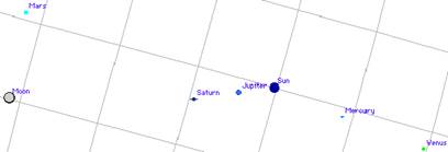 2000 May 5-6 (Iyar 2, 5760) – The five visible planets, the sun, and the moon line up in a straight line. Josephus says that these seven celestial bodies represent the menorah, the candlestick, in the Temple. Iyar 2 is when both the first and the second Temples were begun. The five classical planets plus the sun and moon span 26°, their closest separation since 1962 and their closest until 2675. Only Venus in the morning and Mars and the crescent moon in the evening might be visible. Ecliptic grids are 5° apart.