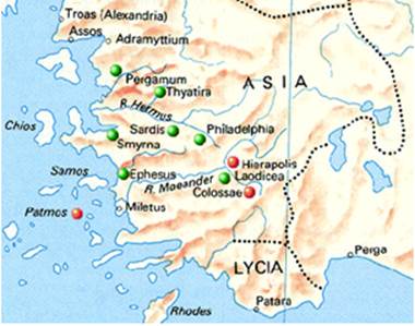 The seven congregations to which the seven letters were addressed were those of Ephesus, Smyrna, Pergamos, Thyatira, Sardis, Philadelphia and Laodicea. These cities stood along one of the ancient postal Roman roads of that day, and, beginning at Ephesus, would have been visited in the order in which they are named. The distance between them is about 50-60 kilometers; a full day's journey, on foot.