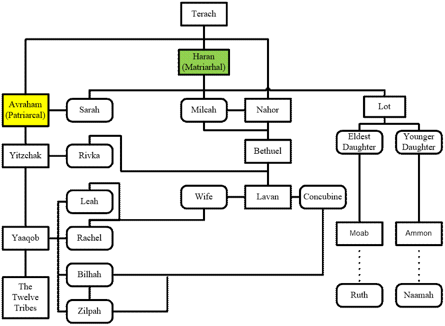 This also suggests that the maternal ‘genes’ of Mashiach were passed down from Haran. The following genealogical chart shows the patriarcal (square cornered rectangular boxes) and matriarchal lines (rounded corner rectangular boxes) of Mashiach: