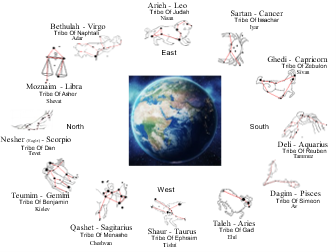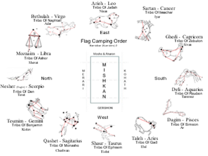 Bamidbar (Numbers) 2:2 'The children of Israel shall pitch by their fathers' houses; every man with his own standard, according to the ensigns; a good way off shall they pitch round about the tent of meeting. 3 Now those that pitch on the east side toward the sunrising shall be they of the standard (דֶּגֶל) of the camp of Judah, according to their hosts… 5 and those that pitch next unto him shall be the tribe of Issachar; … 7 and the tribe of Zebulun; … 9 all that were numbered of the camp of Judah being a hundred thousand and fourscore thousand and six thousand and four hundred, according to their hosts; they shall set forth first. … 10 On the south side shall be the standard (דֶּגֶל) of the camp of Reuben according to their hosts; … 12 and those that pitch next unto him shall be the tribe of Simeon; … 14 and the tribe of Gad; … 16 all that were numbered of the camp of Reuben being a hundred thousand and fifty and one thousand and four hundred and fifty, according to their hosts; and they shall set forth second. … 18 On the west side shall be the standard (דֶּגֶל) of the camp of Ephraim according to their hosts; … 20 and next unto him shall be the tribe of Manasseh; … 22 and the tribe of Benjamin; … 25 On the north side shall be the standard (דֶּגֶל) of the camp of Dan according to their hosts; … 27 and those that pitch next unto him shall be the tribe of Asher; … 29 and the tribe of Naphtali;