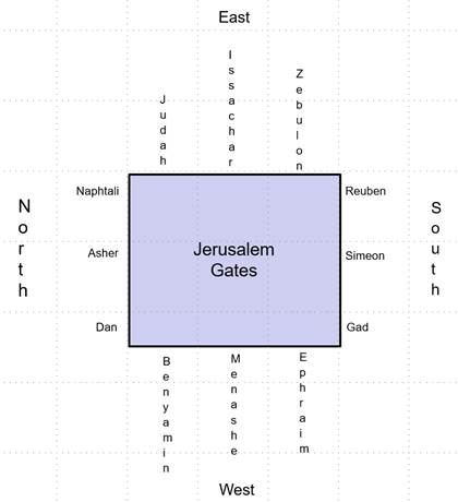 shall be on the west side; Dan, Asher, and Naphtali shall be on the north side;