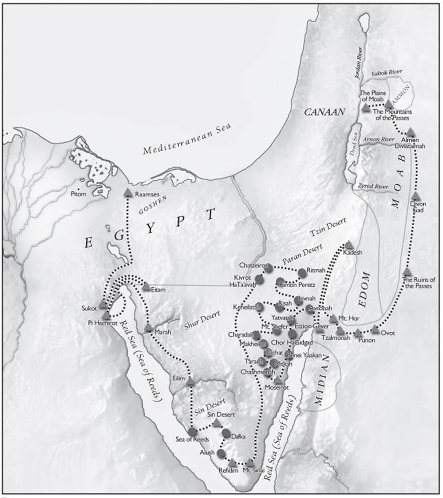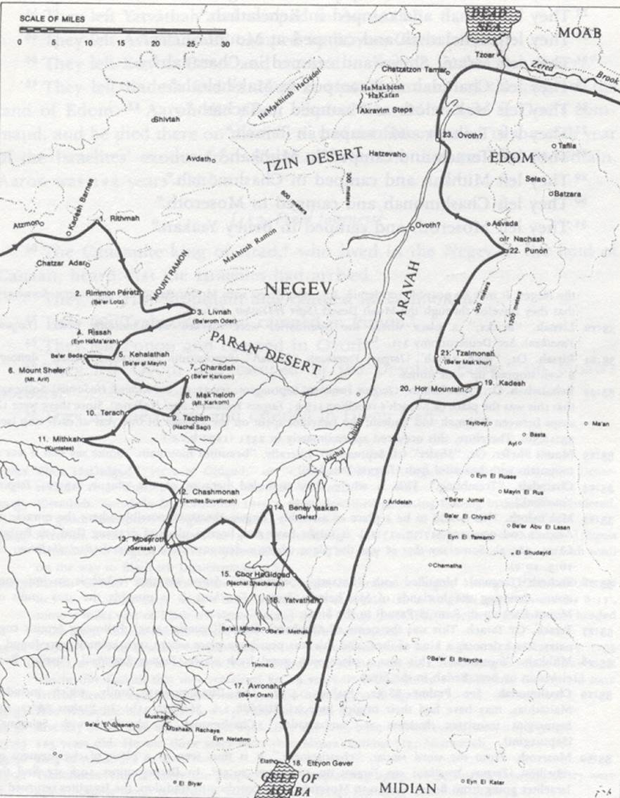 Why were these journeys recorded? To make the Omnipresent’s benevolence known. For, although He decreed to move them about and cause them to wander in the wilderness, do not say that they wandered and were moved about from journey to journey all forty years, and had no rest--- for there are only forty-two journeys here. Subtract fourteen, all of which took place during the first year, before the decree, from their journey from Rameses until they reached Rithmah, from where the spies were dispatched, as it is said, “after, the people journeyed from Chatzeroth, etc. Send, for yourself, men, etc.,” and here it says, “they journeyed from Chatzeroth and camped at Rismah,” you learn that it was in the desert of Paran. Exclude, further, from there, eight journeys which took place after Aharon’s death, from Mount Hor to the plains of Moab, during the fortieth year, it is found that, throughout the thirty eight years, they took only twenty journeys.[14]
